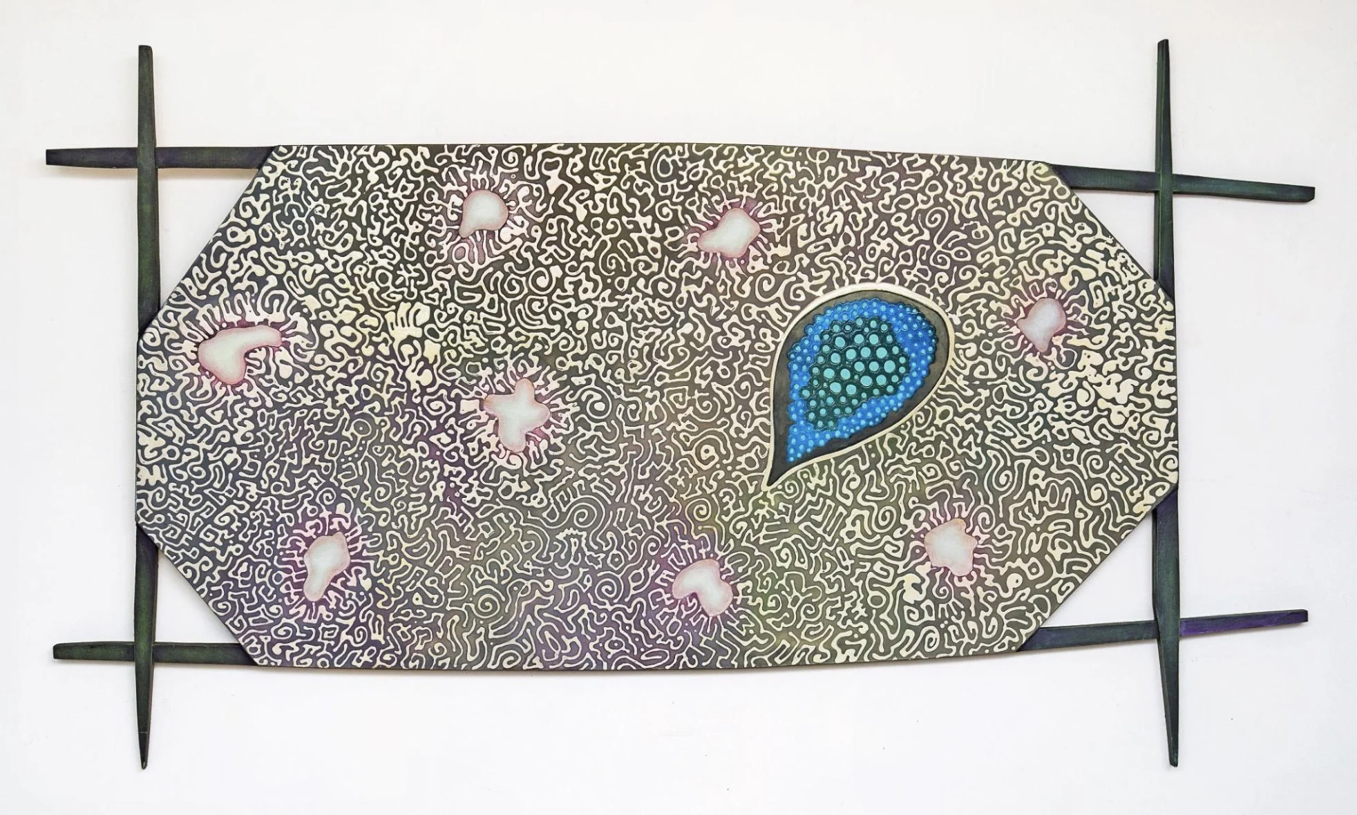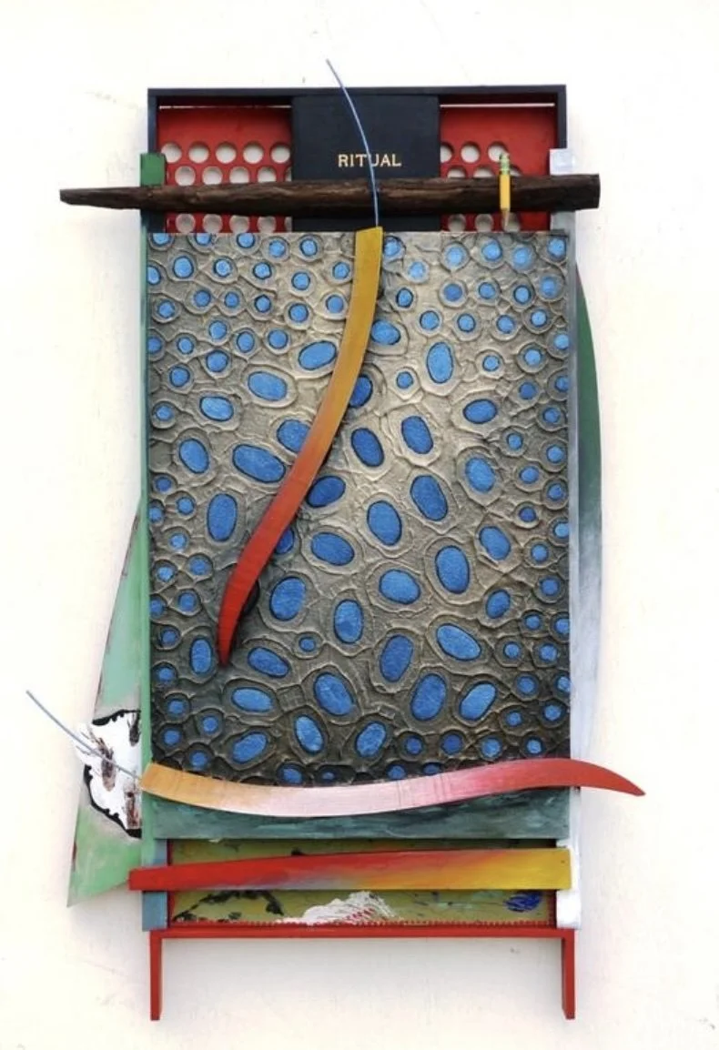 Rufus Snoddy was born in East Texas, moved with his parents to Los Angeles. and grew up there in the inner city schools listening to the sound and texture of many languages in the halls and classrooms. He watched Los Angeles change from street cars and Hollywood bungalows to freeways and gated communities. He graduated from California State University at Los Angeles with an MFA. And continued to work and exhibit there until 2002 when he moved to Traverse City and taught Studio Arts and Design at Northwestern Michigan College until 2022. He has shown throughout the country and abroad, including Los Angeles, New York, and Paris. We at Red on Blue and the South Haven Area are honored to have him here. The striking color and form of Snoddy’s work also carries a message. He sees himself as part of a long line of messengers beginning with the early messengers whose work we see on the walls of caves. “ I see myself as just another messenger, hopefully with an innovative perspective.”